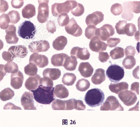 - 简答题2、【提示】进一步检查血细胞分类形态,提示外周血淋巴细胞比例78%,多数为小一中淋巴细胞,部分有细胞的毛刺样突起,染色质比正常淋巴细胞略疏松,浆灰蓝或深蓝色,有的有泡沫感(图26)。患者的诊断可能是?