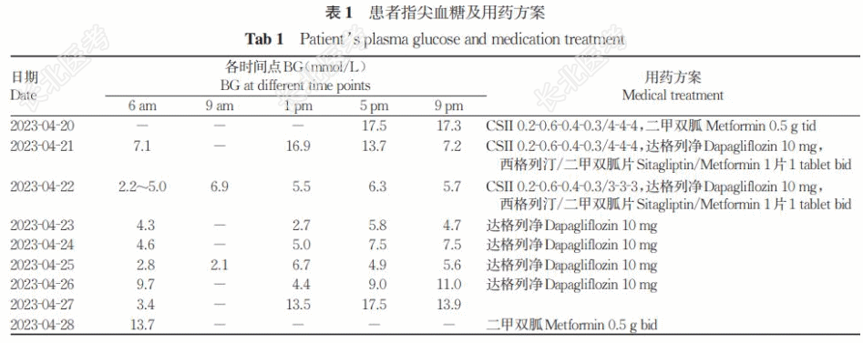 入院诊疗经过:患者入院后予胰岛素泵(CSII)联合口服降糖药物(二甲双胍、达格列净、西格列汀)控制血糖,补铁等对症治疗。CSII治疗2d后出现反复空腹低血糖,逐渐减量至停用所有降糖药物并调整为多次进餐后血糖尚平稳,但数日后再次出现餐后高血糖,口服二甲双胍0.5g,2次/d。患者指尖血糖及用药方案见表1。