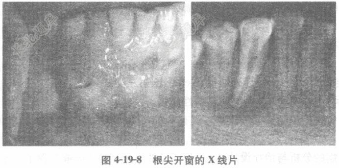 松动(-)、叩(-),临床牙冠长度正常。44牙冠变色,冷热诊(-),叩(-),根尖开窗,根尖暴露。X线片显示44根尖有透射区,边界不清,无骨白线(图4-19-8)。