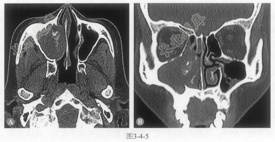 A、右侧中鼻道及右侧上颌窦内见一软组织密度肿块充填,大小约38mm×40mm