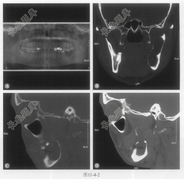 [材料题] 患者男性,67岁,左下颌肿大半年,局部轻压痛。影像如图11-4-2,病变内CT平均值17HU。