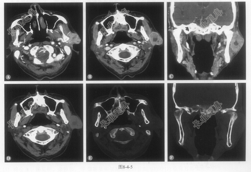[材料题] 患者男性,86岁,发现左耳前包块1年,质地较硬。CT图像如图8-4-5(病灶实性成分CT值:平扫38~40HU、动脉期76~101HU、静脉期85~98HU、延迟期80~85HU)。