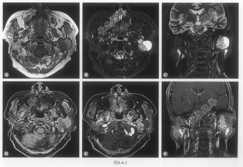 - [材料题] 患者女性,67岁,发现左耳下包块1年,查体:左侧耳垂下部扪及包块,质韧,活动欠佳,边界欠清。MRI图像如图8-4-1。