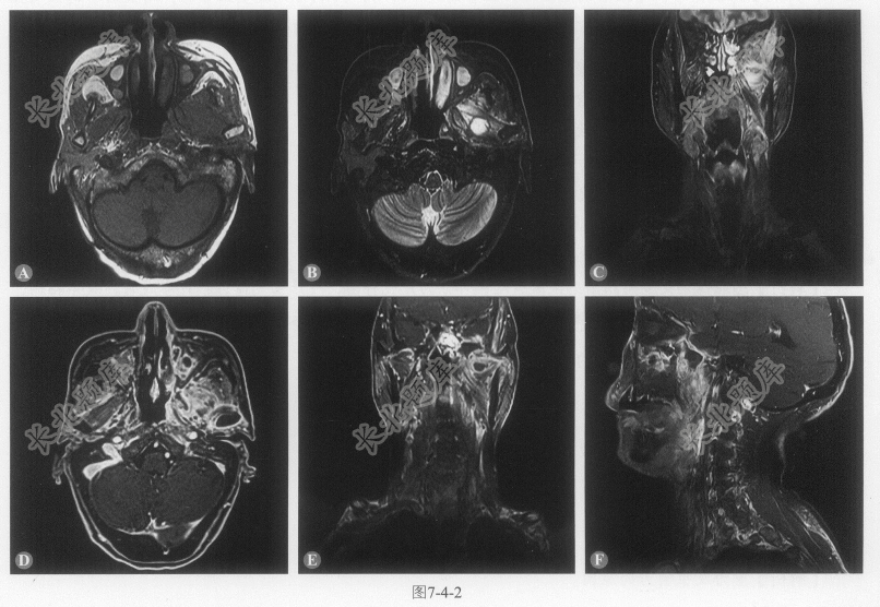 患者男性,61岁,鼻阻伴脓涕40余年,再发加重半月,查体:左侧面颊部肿胀。MRI图像如图7-4-2。