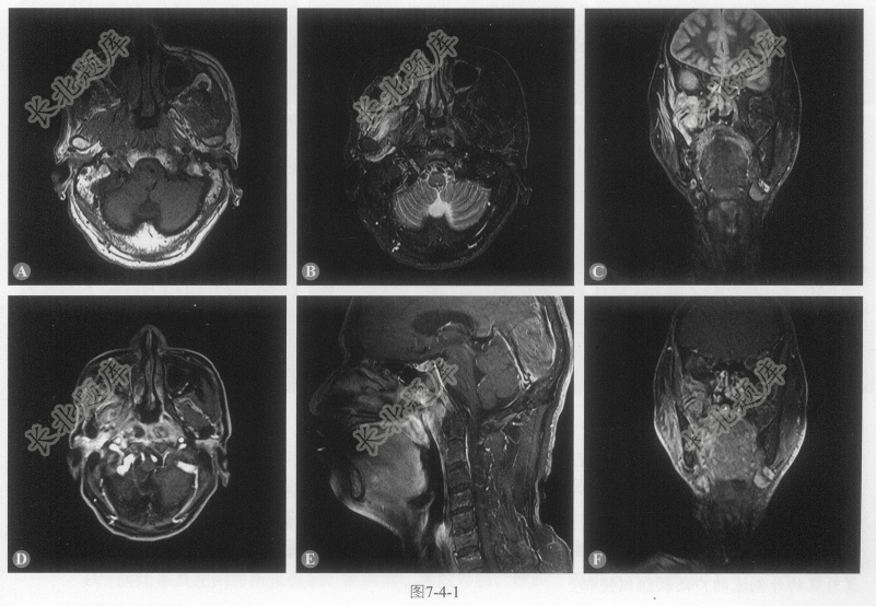- [材料题] 患者男性,60岁,鼻阻伴回涕带血半年,查体:鼻咽部见新生物膨隆,触之不易出血。右侧额纹、鼻唇沟较对侧变浅。MRI图像如图7-4-1。