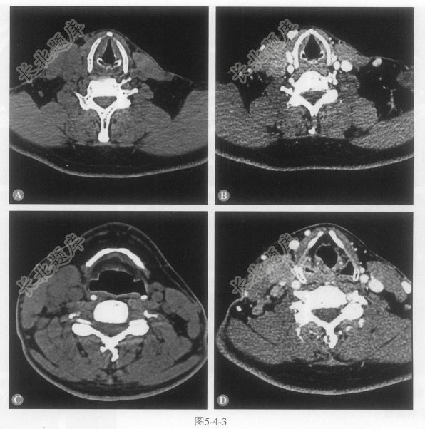 患者男性,46岁,慢性起病,主因发现右侧颈部肿物2年6个月入院。患者于入院前2年6个月发现右侧颈部肿物。查体示:右侧颈部胸锁乳突肌中1/3水平可触及肿物,质硬,与周围组织界限不清,大小约3cm×3cm×2cm(图5-4-3)。