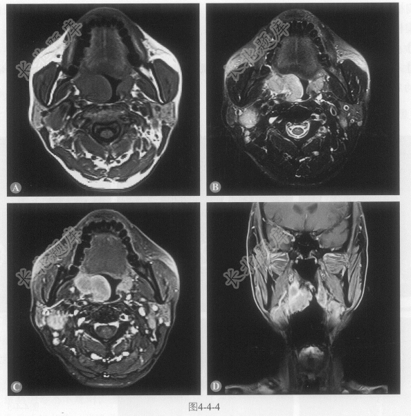 [材料题] 患者男性,65岁,2周前无明显诱因出现吞咽困难,伴咽部疼痛、明显异物感,近2日加重就诊。MRI图像如图4-4-4。