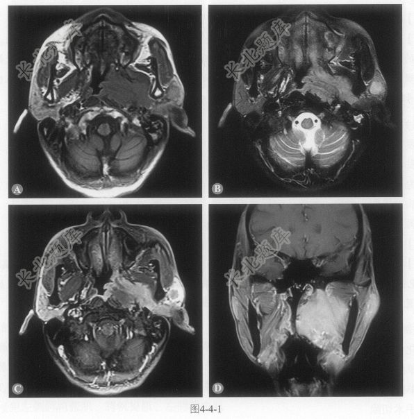 - [材料题] 患者男性,64岁,发现颈部肿物20余天,夜间疼痛,左耳听力下降,伴有鼻塞,查体:肿物质硬、可活动。MRI图像如图4-4-1。