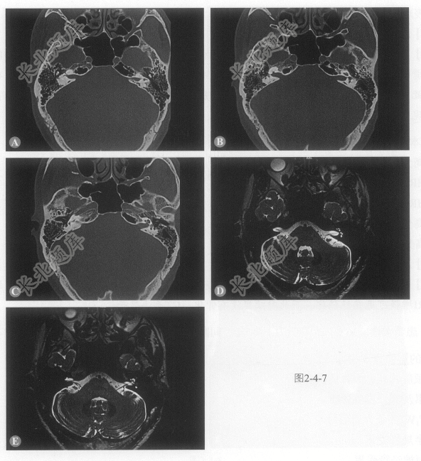 患者男性,39岁,右耳听力下降8年,CT和MRI表现如图2-4-7。