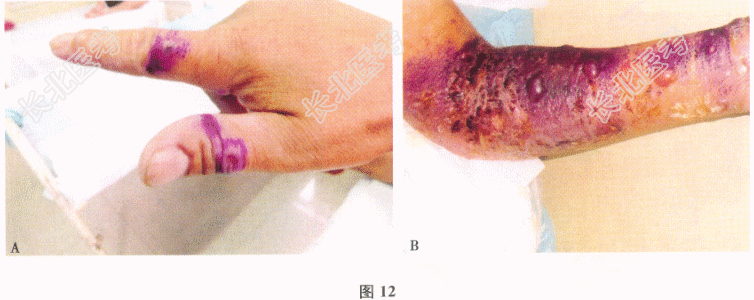 - [材料题] 患者男性,46岁,从事牛肉贩运工作。以“发热5天,右手及前臂肿胀4天”就诊。患者5天前无明显诱因出现发热,体温最高达38.5℃,头痛,全身不适;4天前出现右手及前臂瘙痒,有红色皮疹,肿胀,自服布洛芬混悬液(美林)后,仍反复发热。就诊当日右前臂皮肤肿胀明显,出现水泡。患者发病后无发冷寒战,无咳嗽咳痰,无腹泻腹痛,无头痛及呕吐等症状。查体:体温38.2℃,心率92次/分,呼吸22次/分,血压120/80mmHg(1mmHg=0.133kPa)。神志清楚,急性病容,右手及前臂可见肿胀水泡(图12A,12B),右腋下淋巴结肿大,有触痛;球结膜无水肿;颈软;双肺未闻及干湿性啰音,心音有力律齐,各瓣膜听诊区未闻及病理性杂音;腹平软,无压痛,肝脾肋下未触及,克氏征Brudzirnki征巴宾斯基征均阴性。血常规检查:白细胞计数13.5×109/L,中性粒细胞0.83,淋巴细胞0.143,血红蛋白151g/L,血小板计数131×109/L。