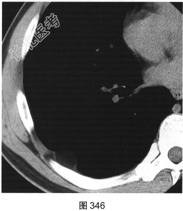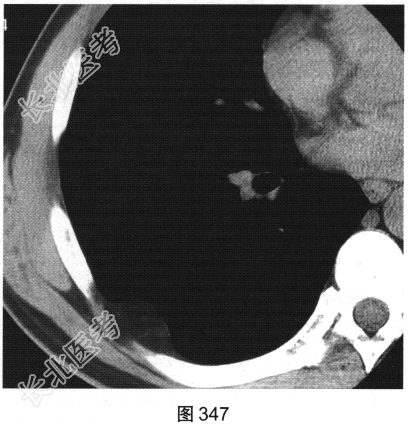 患者男性,43岁,平素健康,偶感深吸气时右后背部不适。近期该患者单位组织体检,在行胸部CT扫描时发现胸壁肿物,见图346、图347。