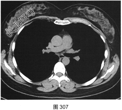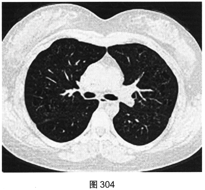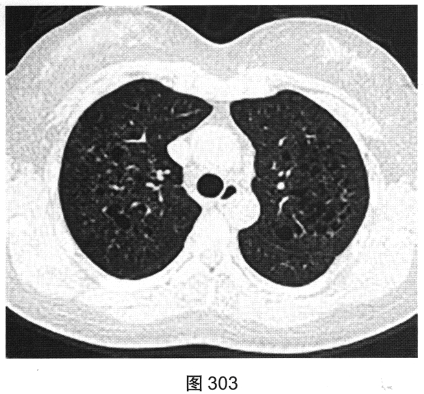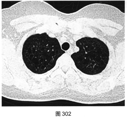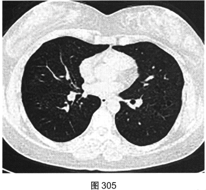 - [材料题] 患者女性,32岁,因“间断刺激性干咳1年,发现肺部囊性病变8个月”就诊。患者无发热、咯血、胸痛、呼吸困难。服甘草片、阿莫西林无明显好转。胸部HRCT如图302~图307所示。