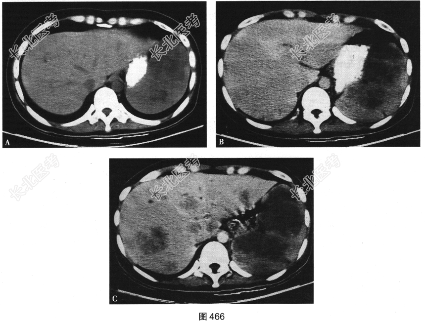 - 多项选择题2.[提示]患者行腹部CT检查,如图466所示。A、B为患者第一次检查时图像(A为CT平扫图像, B为CT增强扫描图像),C为患者45天后复查CT增强扫描图像。结合CT检查所见, 该患者的诊断为( )