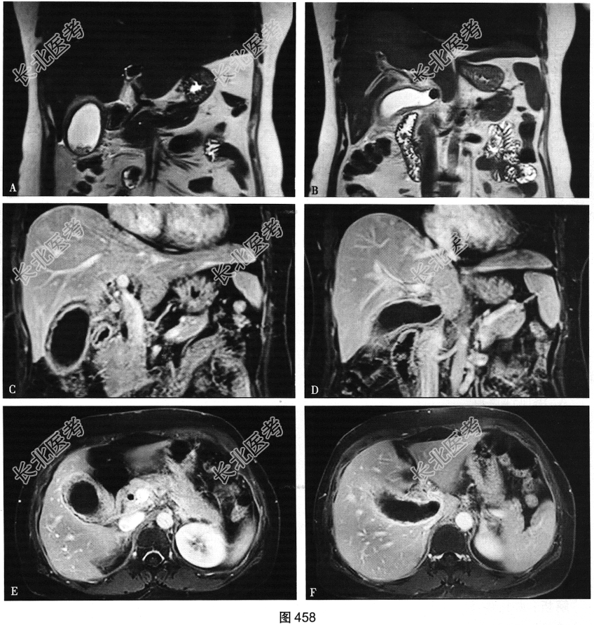 - 多项选择题4.[提示]患者行急诊超声检查发现异常,进一步行腹部增强MRI检查, 如图458所示。根据患者以上检查结果,考虑可能的诊断是( )