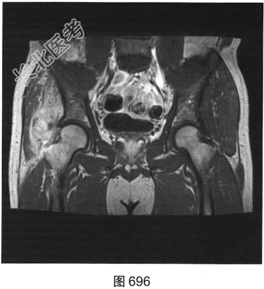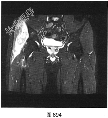 - [材料题] 患者为中年男性,发现右髋部外上方包块伴疼痛3周,以胀痛为主,包块大小为5cm×4cm,质硬,无发热、流脓流血,右下肢关节的感觉、活动、血运正常,自服止痛药治疗,疼痛稍有所缓解。查体:皮肤黏膜色泽正常,浅表淋巴结未触及,局部皮温稍高,皮肤无溃疡。
