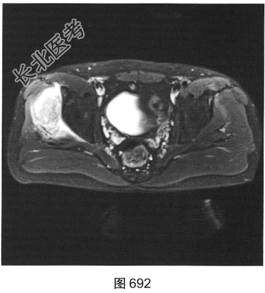 F、与邻近肌肉相比,T1WI呈等信号;T2压脂序列呈明显高信号