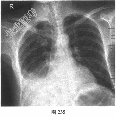 - 多项选择题3.[提示]患者入院后查体:右下肺呼吸音消失, 无干湿性啰音,叩诊呈实音。查胸部X线片(图235)提示右下肺大片高密度影, 呈内低外高弧形。为明确诊断,患者还应完善下列哪些检查( )