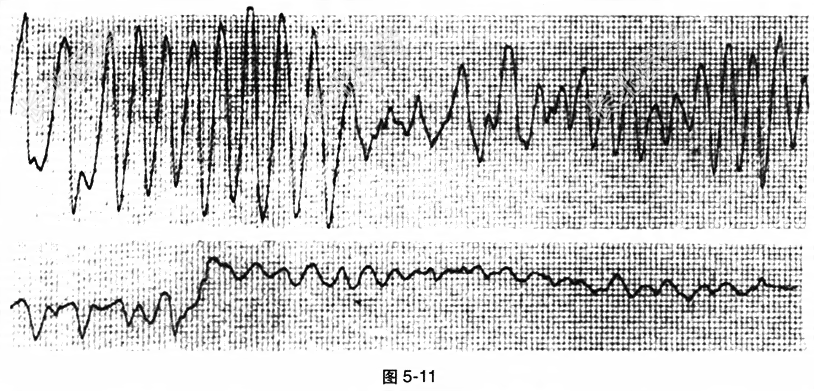 - [材料题] 患者,男性,34岁,主因“误服药酒后口周及肢体麻木3小时”入院。否认高血压、冠状动脉粥样硬化性心脏病、糖尿病病史。患者于入院前3小时误服川乌草药酒约150ml,30分钟后出现口舌及四肢麻木、恶心、呕吐、感心悸。入院1小时出现面色苍白、大汗淋漓,进而晕厥。入院时查体:BP90/60mmHg,HR160次/min,心律不齐,大汗,皮肤湿冷。心电监护示反复多形室性心动过速,双向室性心动过速,尖端扭转性室性心动过速、心室颤动(图5-11),急查电解质血[K⁺]3.31mmol/L,血糖正常。反复给予直流电复律,电除颤。