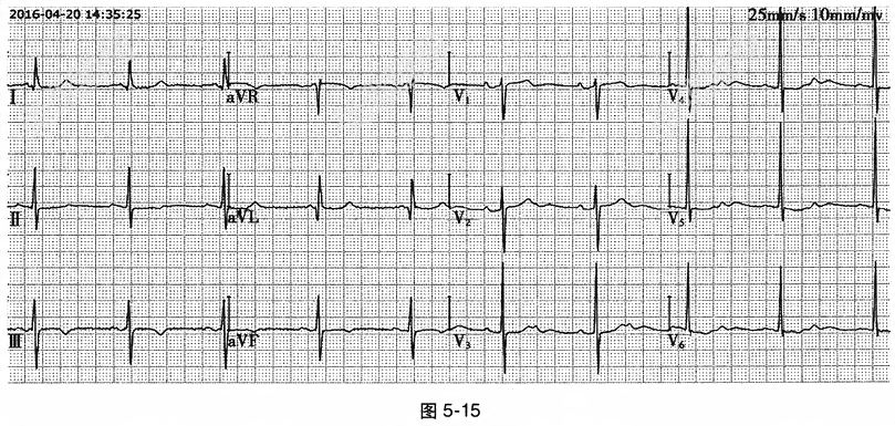 - [材料题] 患者,女性,46岁。既往高血压病20余年,2年前开始出现日常活动下胸闷、心悸,口服“麝香保心丸”略有缓解,4小时前患者胸闷加重,自服硝酸甘油片后出现头晕伴黑矇,自述其母及妹妹有类似病史。查体:BP 182/89mmHg,HR 55次/min,心律齐,心界不大,心尖内侧可闻及3/6级收缩期杂音,肺部查体未发现阳性体征,心电图见图5-15。
