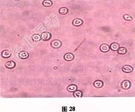 患者男性,42岁。由于下腹不适到医院就诊。取患者的晨尿做检查,尿沉渣镜检结果如图28所示。