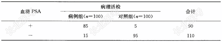 - [材料题] 某实验室以病理活检为诊断前列腺癌的金标准。现有前列腺癌病例组与对照组各100例,采用检测血清前列腺特异性抗原(PSA)的方法得到下列检测结果。
