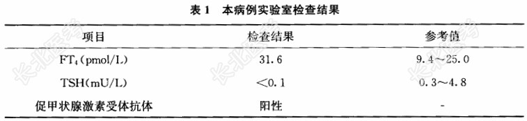 - [材料题] 患者女性,30岁,因身体不适、肌肉疼痛数个月就诊。食欲正常,但近期有腹泻,体重减轻5kg,有双手震颤,并总感觉疲乏无力心悸。查体心律94次/分,血压140/70mmHg,甲状腺呈弥漫性增大,上睑下垂,眼球突出。实验室检查结果见表1。