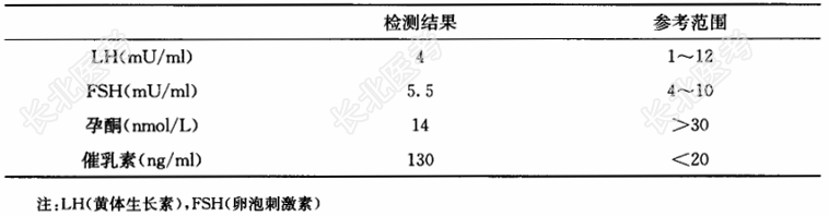 - [材料题] 32岁女性,结婚8年。停服避孕药2年,一直未孕。患者月经史正常,无妊娠史,否认妇科疾病,无泌乳、体重增加、多毛及服药史。其配偶两次检查结果均正常。患者实验室检查结果如下表。