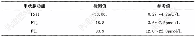 - [材料题] 患者男性,36岁,因2个月前发现颈部增粗,伴有心悸、怕热、多汗、食欲亢进,易情绪激动及体重下降(近2个月体重下降约5kg)就诊。查体发现双侧甲状腺Ⅲ度肿大,质中等,颈部皮肤发红,听诊可闻及血管杂音。心率106次/分,律齐。无胫前黏液性水肿,眼球无突出。实验室检查:WBC:5.1×109/L,NEUT%:64%;肝功能:正常;甲状腺功能检查结果如下表。