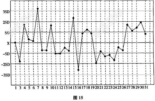 作为质控规则,图15为该实验室6月份的白细胞计数项目室内质控图。