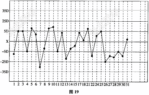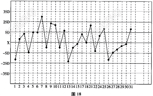 作为质控规则,每批测定2个水平的质控品,图18、图19为该实验室5月份的红细胞计数项目室内质控图。 水平1: