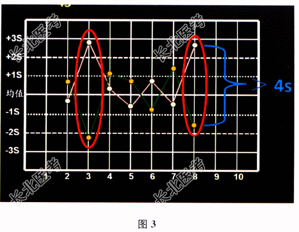 B、在同一天质控检测,一水平质控结果超出+2s,另一水平质控结果超出-2s