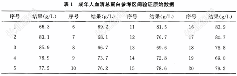 [材料题] 中华人民共和国卫生行业标准《临床常用生化检验项目参考区间》规定了中国成年人血清总蛋白的参考区间为65~85g/L,某实验室在应用上述参考区间前,对该参考区间进行了小样本验证。表1为该实验室按照筛选标准从本地参考人群中募集参考个体20人,采样并测定血清总蛋白,获得的20个测定值(无离群值)。