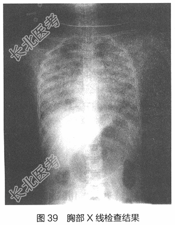 - 多项选择题4.[提示]血常规:外周血WBC 0.8×109/L, N 0.60,Hb 72g/L, PLT 70×109/L,CRP> 160mg/L;血气分析: pH 7.36,PaO2 56mmHg, PaCO2 28mmHg,BE-5mmol/L(FiO2 60%)。胸部X线片如图39所示。结合病史, 考虑诊断为