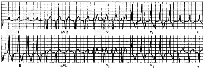- [材料题] 一不稳定型心绞痛患者,突感心悸、胸痛、出汗,BP80/50mmHg,脉搏触不清,心音弱,无杂音。心电图如图示。