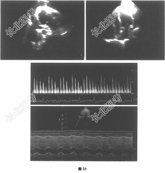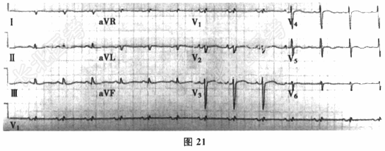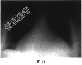 - 多项选择题4.[提示]心电图提示低电压,电轴右偏, 非特异性复极异常(图21),胸部X线片显示心影扩大(图22)。经胸心脏超声检查显示: 静息状态下未见节段性室壁运动异常,左心室流入道吸气时舒张早期流入速度下降50%。肋下M型超声测量下腔静脉显示下腔静脉扩张30mm, 吸气时未能回缩(图23)。