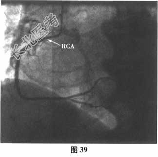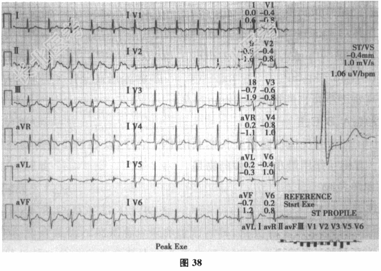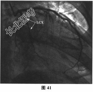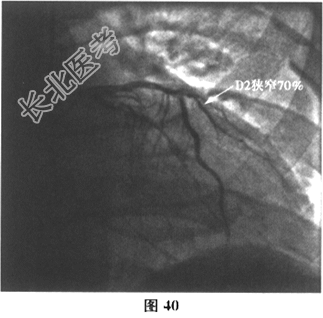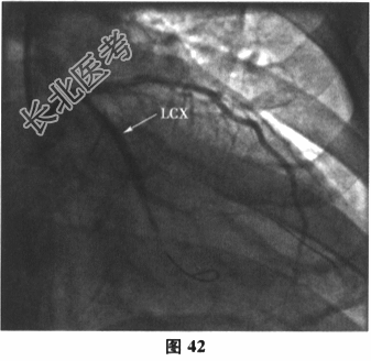 - 多项选择题6.[提示]运动负荷心电图试验示:最大运动功量3.3METs, Ⅱ、Ⅲ、aVF、V3~V4导联ST段压低0.05~0.1mV(图38)。查血小板聚集率:Ara14.57%, ADP36.55%。再次行冠状动脉造影:回旋支近端次全闭塞, LCX内支架内膜重度增生;LAD中段斑块浸润, 最重狭窄30%~40%,轻度肌桥压迫, 第二对角支狭窄70%;RCA近段斑块浸润, 如图39~图41所示。故于回旋支再次植入一枚支架(Promus Element2.75mm×38mm),如图42所示。