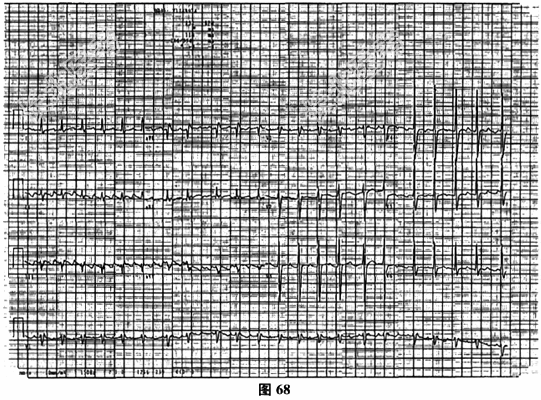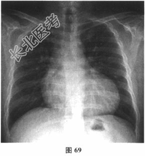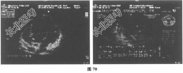 - 多项选择题2.[提示]血常规:白细胞12.4×109/L, 血红蛋白90g/L,血小板143×109/L。心电图示房扑2: 1下传(图68),心室率130次/分。胸片(图69): 心影增大。超声心动图(图70):心肌病变, 全心增大,左室心尖部存在较多肌小梁, 收缩末期非致密层与致密层之比为1:4, 左室舒张末内径70mm,左室收缩功能减低, LVEF32%,轻至中度二尖瓣关闭不全, 轻-中度三尖瓣关闭不全,下腔静脉增宽, 未见心包积液。