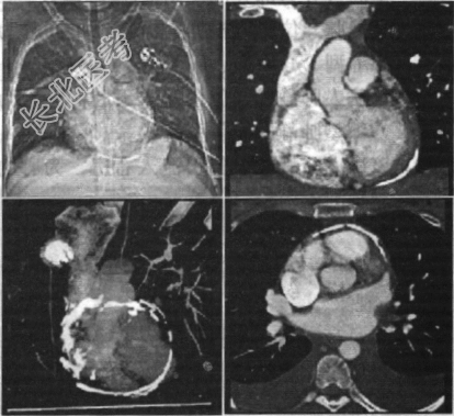 - 多项选择题58岁男性患者,曾患肺结核, 心悸气促乏力,下肢肿胀半年余, 胸部CT扫描如下图,描述正确的是
