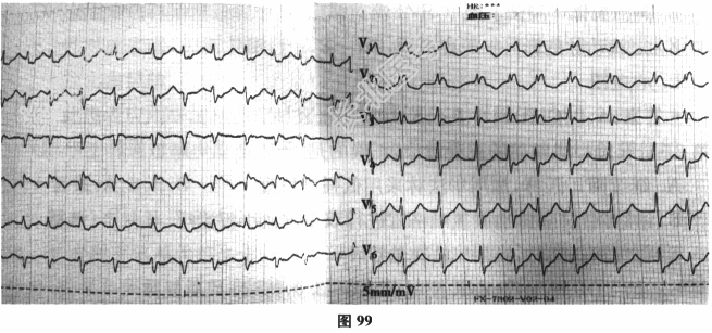 - [材料题] 患者男性,75岁,因"心悸、气促1周,加重3小时"入院。患者1周前生气后出现心悸、气促,休息后不能缓解,活动后加重。自服用酒石酸美托洛尔症状似有好转。近3天发现双下肢水肿,夜间出现阵发性呼吸困难并进行性加重,就诊当天不能平卧,咳粉红色泡沫样痰。既往史:高血压病20余年,糖尿病10余年,高脂血症6年,5年前因心前区疼痛诊断为急性前壁心肌梗死,冠状动脉造影提示3支血管弥漫性病变,在左前降支及右冠状动脉分别植入2个支架。规律服用拜阿司匹林、倍他乐克、立普妥等药物治疗,否认脑血栓史。查体:BP160/65mmHg,HR148次/分,RR22次/分。意识清醒,端坐位,喘息状态,颈软,颈静脉无充盈,双肺呼吸音低,双肺底可闻及湿啰音,律不齐,心尖部第一心音强弱不等,腹软,肝肋下可及边缘,触痛?肝-颈静脉回流征(-),移动性浊音(-)。双下肢胫骨前可凹性水肿(+),心电图如图99所示,CTNI:0.06ng/ml。