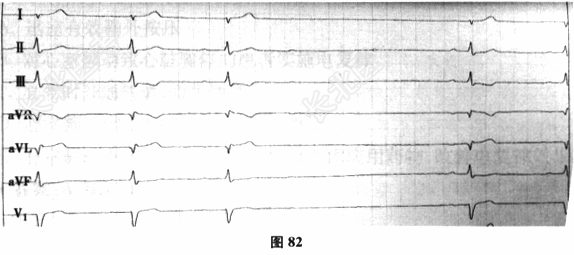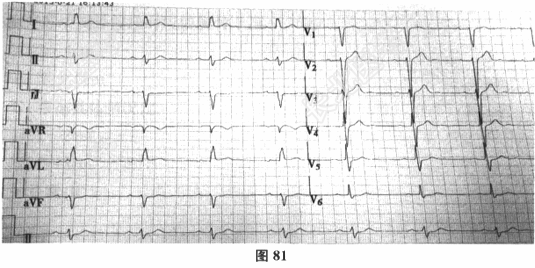 - 多项选择题3.[提示]患者完善脑CT检查提示:多发性腔隙性脑梗死。24小时动态心电图: 窦性心律,偶发房性期前收缩, 偶发室性期前收缩,未见ST-T改变。超声心动图提示: 房室大小均在正常范围,左室舒张功能减退, 射血分数正常。行颈动脉按摩患者未诉明显不适,监测生命体征无变化。直立倾斜试验为阴性。患者于入院后第四天和他人交谈时, 再次神志丧失,持续约数秒, 发作后心电图提示(图81):窦性心动过缓, 最慢心率为46次/分。D二聚体:0.42mg/L, 血气分析:均在正常范围。此患者应进一步完善