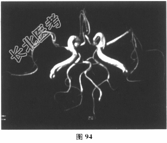 - 多项选择题3.[提示]给予患者药物治疗:口服阿司匹林100mg, 1次/天,氯吡格雷75mg, 1次/天,阿托伐他汀20mg, 1次/睡前。1天后未再出现神经功能障碍。头、颈部CTA:右侧大脑中动脉重度狭窄, 主动脉弓和颈动脉硬化,进一步证实了右侧大脑中动脉狭窄诊断(图94)。