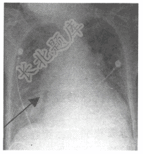 - 单项选择题男性患者,70岁。因呼吸困难、咳出泡沫样痰入院。胸部X线平片如下图。右中肺野斜行线状影(箭头)为